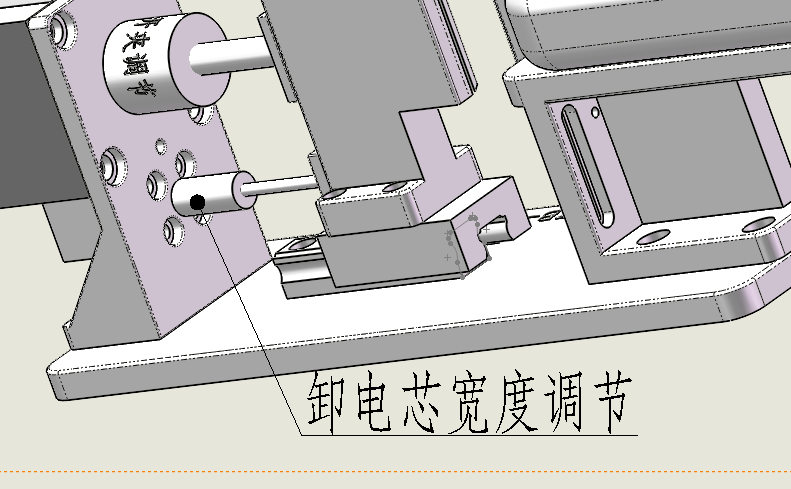 3、    將13調(diào)節(jié)到鐵夾裝電芯后寬度并鎖死,踩動小氣缸腳踏開關(guān),將已化成完畢的大力鐵夾帶電芯置于開夾器的5與6的卡槽內(nèi)。